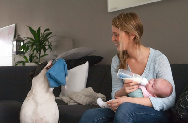 - Bringing baby home and introductions: Before we went home from the hospital I gave my brother a Ziploc Bag full of a few items of clothing that my son had worn. My brother let my dogs sniff the clothing ahead of time, which helped them learn the baby’s smell. When we arrived home, I went into my house (without my baby) and kissed and hugged my dogs! Then my husband did the same. Only then did we bring in our baby and let the dogs see and smell him. They recognized his scent and they knew that I was there for them, which helped to minimize any feelings of competitiveness.
