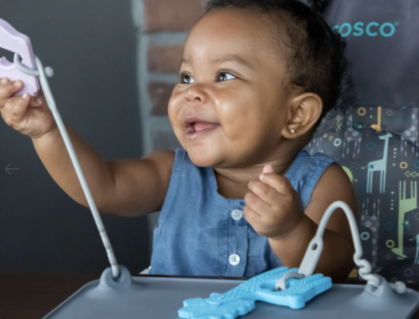 Our hero products are the first-ever placemat and tether system to stop babies from dropping and throwing their toys! The Busy Baby Mat and Mini Mat suction to highchair trays or restaurant tables and have a patented tether system that you can use to hook up any of baby’s favorite toys. They stick wherever suction cups can stick so you can use them to keep toys within reach and off the floor in a variety of places beyond the tabletop – on a window, in the bathtub…they even wrap around handles (hello gross shopping cart handle) and the suction cups stick to each other!